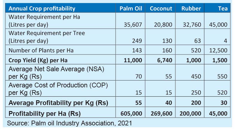 In Southeast Asia, numerous studies showed that oil palm cultivation contributes to income gains, capital accumulation, and higher expenditures on food, health, education, and durable consumer goods in smallholder farm households (Alwarritzi et al. 2016). In Africa, farm households are generally better off cultivating oil palm than when they do not. A study in Ghana showed that oil palm farmers have higher incomes and suffer less from multidimensional poverty than other farmers after controlling for possible confounding factors (Ahmed et al. 2019). When we compare the competing commodities in Sri Lanka, interesting results can be observed. From the table, we can see that the profitability of palm oil per hectare is SLR 605,000, compared to SLR 269,600 for coconut, SLR 200,000 for rubber, and SLR 45,000 for tea. It means that while using much less land and almost the same water level, oil palm can provide a much better financial return to a farmer.